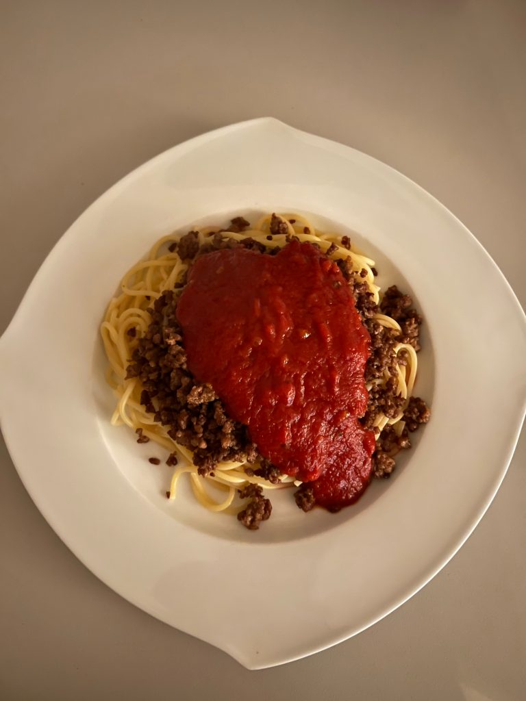 Und dann: Nudeln, Hackfleisch und Sauce getrennt reichen oder Nudeln auf den Teller, Hackfleisch auf die Nudeln und einen Klecks Tomatensauce drübergeben.